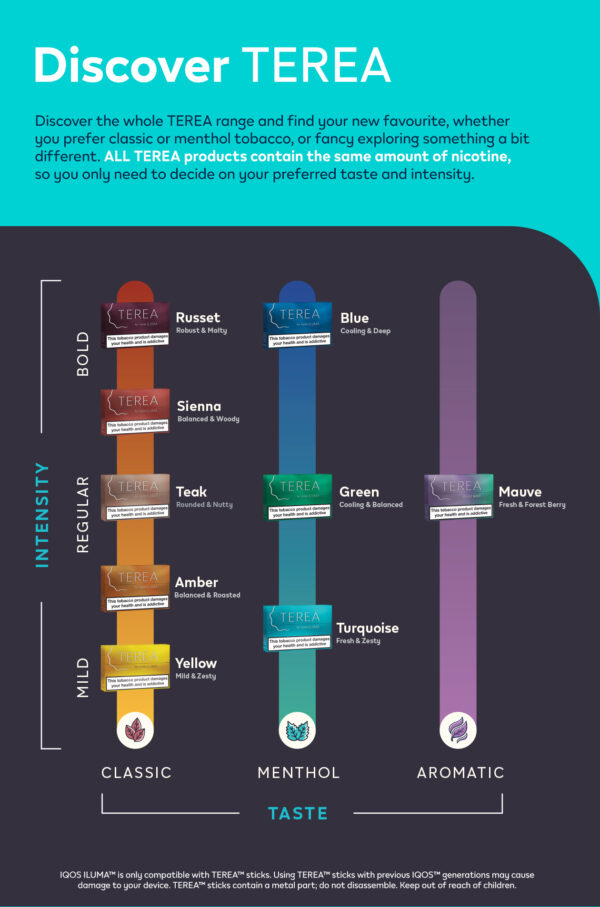 Discover the whole TEREA range and find your new favourite, whether you prefer classic or menthol tobacco, or fancy exploring something a bit different. ALL TEREA products contain the same amount of nicotine, so you only need to decide on your preferred taste and intensity.